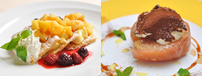 旬のリンゴを使ったデザート。焼きリンゴの中にティラミスを入れ、ナッツとココアパウダーでデコレーション。ティラミスの濃厚な甘さとココアの芳醇な味わいが加わり、クセになるおいしさです。