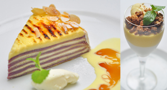 旬を迎える紫芋を使い、紫と黄色の層で彩り豊かに仕上げました。ペースト状にした紫芋、生クリーム、カスタードで層状にし、表面は香ばしくキャラメリゼにしてカリカリに仕上げ、食感にもこだわりました。