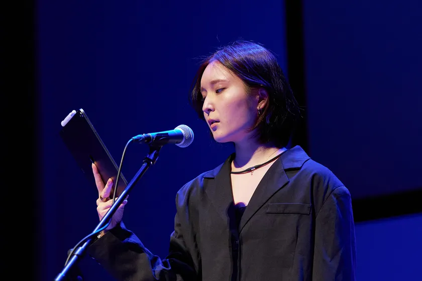 施設出身者を代表して声優である神庭ひろみが、ピアノとヴァイオリンの生演奏と共に、現代社会をテーマにした朗読を披露しました。