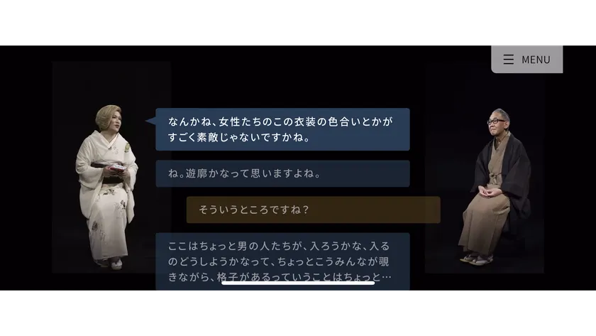 本コンテンツは、2022年に同館で公開した8K映像コンテンツ「時間をこえた出会い―洛中洛外 400年前の京都へ」(東京国立博物館創立150年記念 特別企画「未来の博物館」内で公開)をインクルーシブな視点で改修したもの。共同研究プロジェクトにより制作した国宝「洛中洛外図屏風(舟木本)」の8K3DCGを用いており、6人のナビゲーターが、屏風に描かれた400年前の京都の街並みを読み解き案内します。