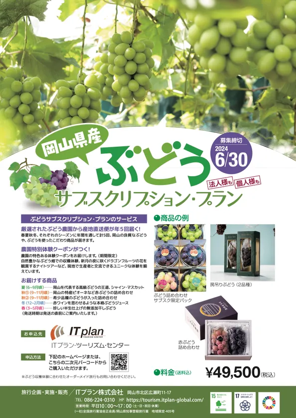 ITプラン株式会社(本社:岡山県岡山市、代表取締役:太田 記生)は、岡山県内のぶどう農園と提携し、年間を通して、ぶどうや6次産業化商品が届く、ぶどうに特化したサブスクリプションサービスの販売を、2024年4月3日(水)より開始いたします。