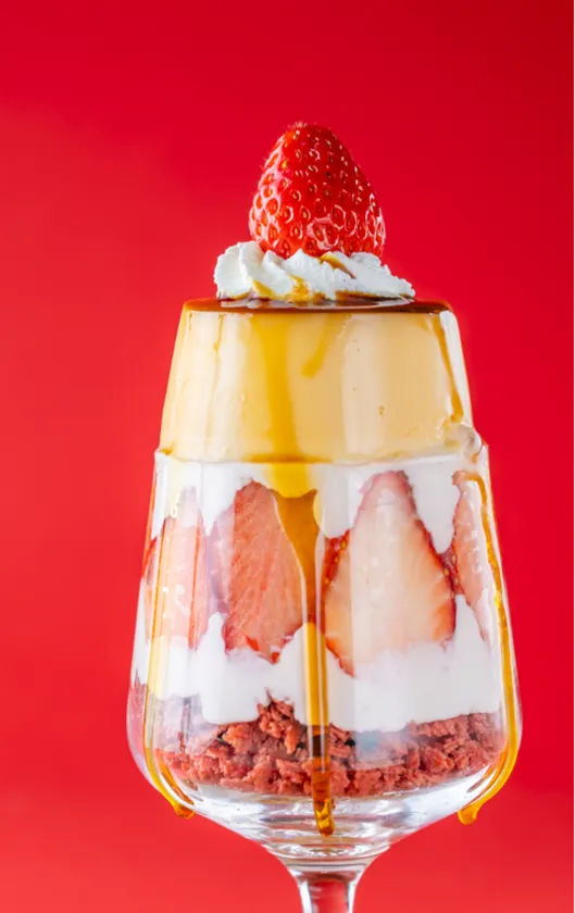 クラシックプリンがまるごと1つのったプリンパフェは、食堂手作りのふわふわパンケーキとプリンが楽しめます。中に入ったティラミスクリームがいちごのさわやかな酸味とプリンをやさしく包みます。