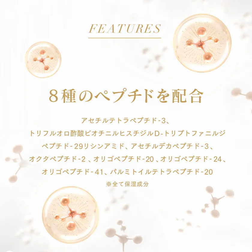 (*2)アセチルテトラペプチド-3、アセチルデカペプチド-3、オクタペプチド-2、オリゴペプチド-20、オリゴペプチド-24、オリゴペプチド-41、トリフルオロ酢酸ビオチニルヒスチジルD-トリプトファニルジペプチド-29リシンアミド、パルミトイルテトラペプチド-20(すべて保湿成分)