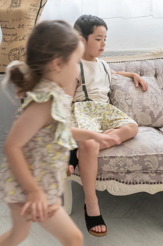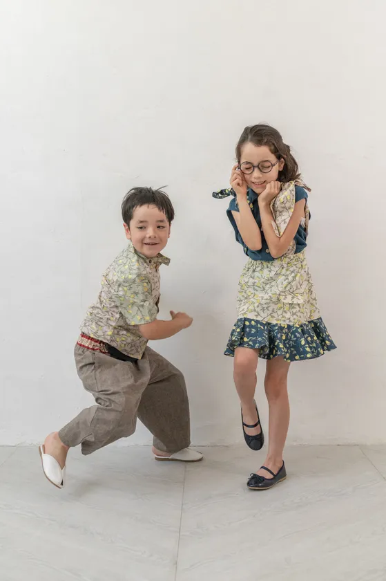 ボタニカルアートのような花柄、レモンをモチーフにした柄などの生地のノスタルジックなムードと、melenaniならではの高い技術でタックやフリルを施し甘すぎず軽やかで、上品な愛らしい表情のワンピース、サロペットスカート、フリルブラウスなどが登場。兄妹・姉弟でシェアできるユニセックスなシャツや、同じモチーフ柄の別アイテムで姉妹兄弟のリンクコーディネイトを楽しむこともできます。全アイテムが日本製の綿100%でご家庭での洗濯が可能です。