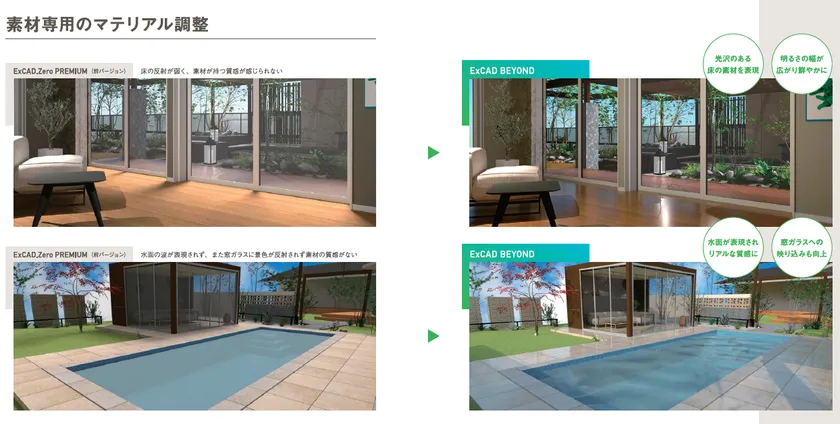 従来は素材が持つ質感が感じられませんでしたが、光沢のある床の素材を表現したり水面の表現、窓ガラスへの映り込みも向上し、よりリアルな質感に近づきました。