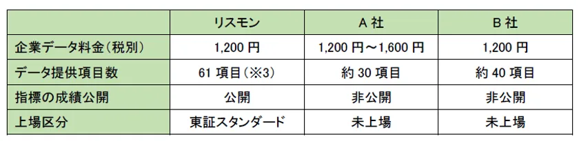 日本国内における与信管理サービス提供会社大手3社(当社含む)のWEB取得サービスを比較。リスモンは1,200円で61項目の企業データを提供し、与信管理サービス業界トップクラスの価格水準と提供項目数を実現します。