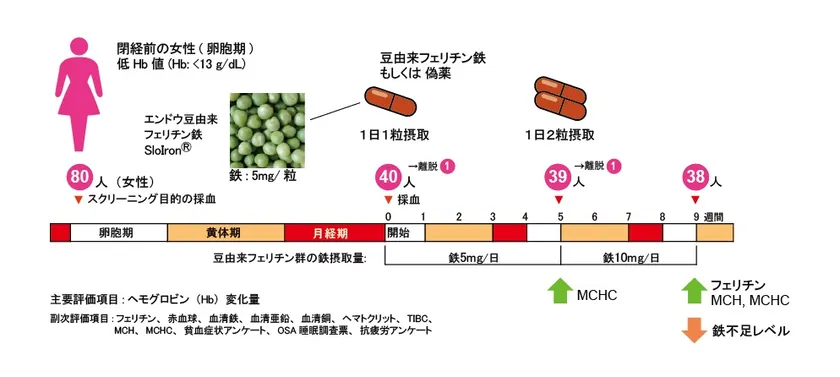 この度、関西福祉科学大学福祉栄養学科と順天堂大学医学部総合診療科研究室によって、豆由来フェリチン鉄の鉄不足の女性に対する有効性を評価した。試験では、豆由来フェリチン鉄(和名:まめ鉄、英名:SloIron)を月経により低ヘモグロビン状態になっている日本人女性(平均33.6歳)に月経直後から9週間摂取させ、鉄不足状態からの回復状況を評価した。豆由来フェリチン鉄(まめ鉄)を配合したカプセル1粒から1日あたり5mgの鉄を5週間摂取し、6週間目から9週間後まで摂取量を2カプセルに増やして1日あたり10mgの鉄を摂取した。