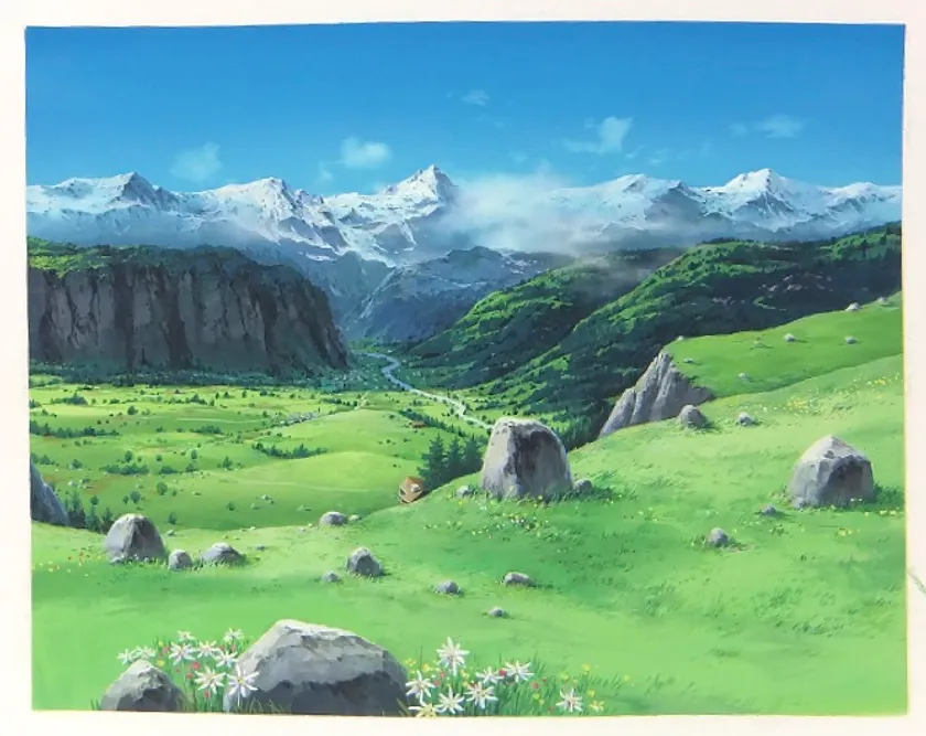 今にもハイジが駆けてきそうな、雄大なアルプスを描いた背景画作品を多数展示。