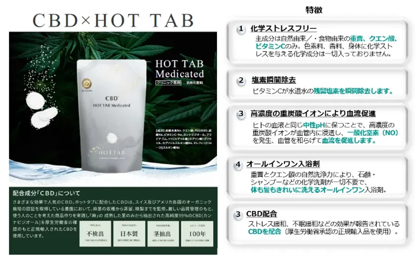本療法の特徴は、各患者様の自宅のお風呂を利用して、重炭酸イオンが豊富に溶け込んだ「HOT TAB Medicated」入浴剤を使用し、30分以上、41℃以下のぬるめのお湯に浸かることで、自律神経の安定化を図り、体のストレスを改善、血流をアップし、体温上昇による治療を行います。この入浴剤は、重曹、クエン酸、ビタミンCとCBDのみの自然/食品植物由来の成分のみで構成されており、余計な化学ストレスを与える化学物質は一切含まないことで、血流アップを最大化して、治療効果を上げております。