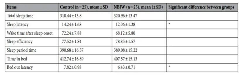 ※活動量計による活動量測定。中性重炭イオン水(NBIW)温浴では通常入浴に比べて睡眠潜時と離床潜時で有意な改善を示した。