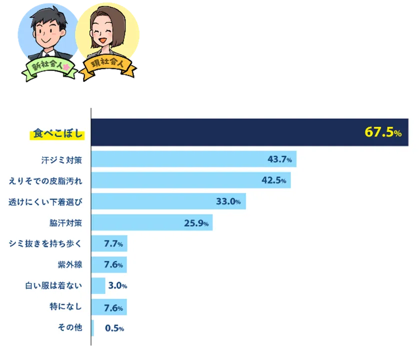 白い服のケアで困ったことはあるかたずねたところ、68.1%が「ある」と回答しました。白い服を着るときに気を付けていることをたずねたところ「食べこぼし(67.5%)」が断トツで1位となり、次いで、「汗染み対策(43.7%)」「えりそでの皮脂汚れ(42.5%)」と続き、白い服だからこそ目立ってしまう日々の汚れが上位にランクインしました。