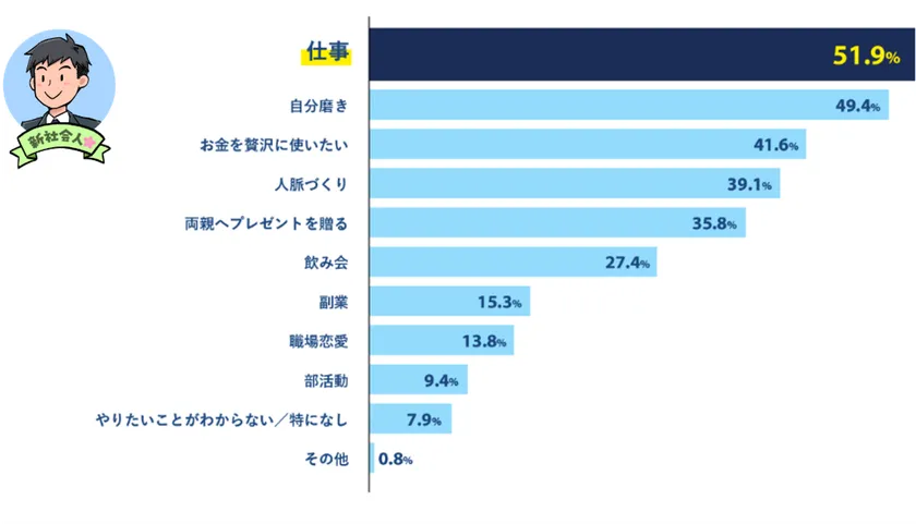 【新社会人が社会人になってやりたいこと、最多は「仕事(51.9%)」】