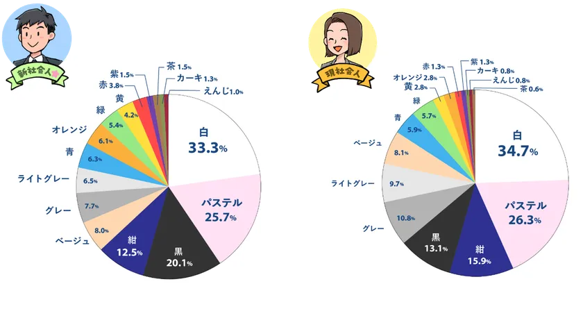 新生活をイメージする色をたずねたところ、全体で34.0%の人が「白」と回答し第1位となりました。次いで「パステルカラー(26.0%)」が選ばれ、爽やかで明るい春を連想する人が多いことがわかりました。新社会人と現社会人をそれぞれ円グラフで比較してみると、大差はないものの、新社会人はベーシックな色をはじめ、現社会人よりも「青」「オレンジ」などビビットな色味にも票が多く入り、多様に分布している傾向がわかりました。