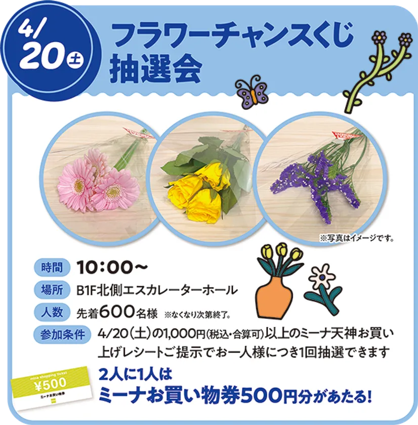 当日、ミーナ天神内でお買い物された1,000円(税込・合算可)以上のレシートをご提示で参加できる「フラワーチャンスくじ抽選会」を開催いたします。2人に1人はミーナお買い物券500円分が当たります。