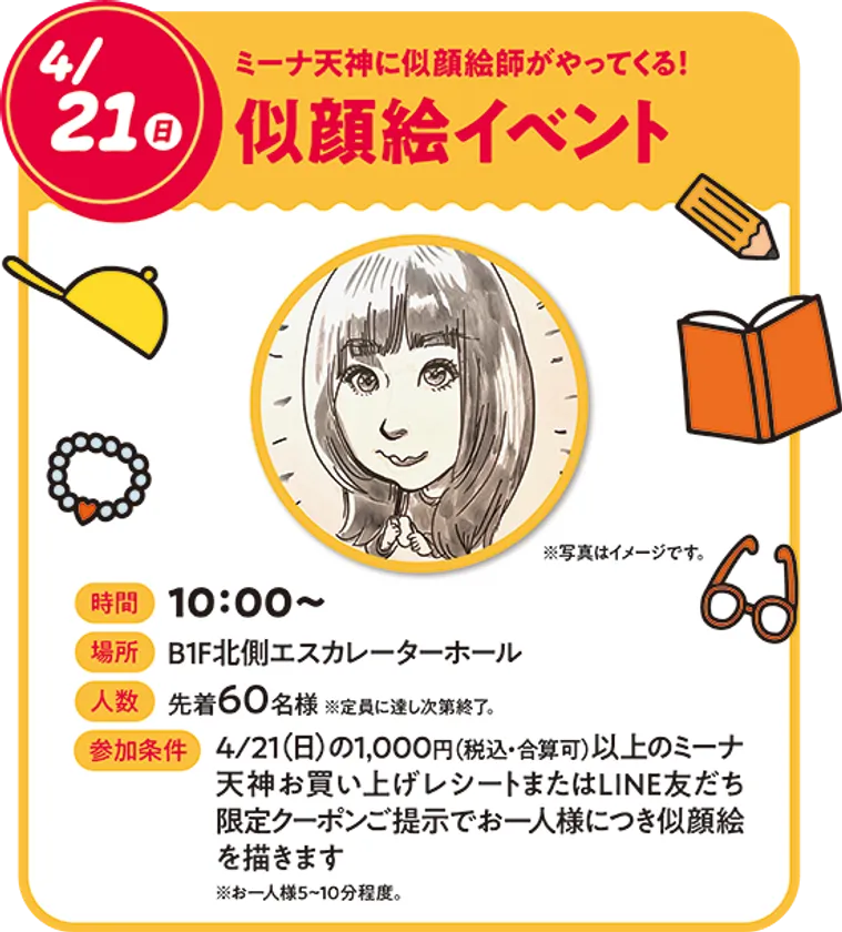 当日、ミーナ天神内でお買い物された1,000円(税込・合算可)以上のレシート、またはLINE友だち限定クーポンをご提示でお一人様につき似顔絵を描きます。