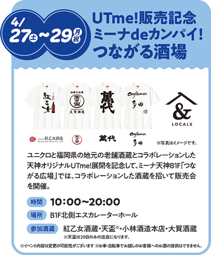 ユニクロと福岡県の地元の老舗酒蔵とコラボレーションした天神オリジナルUTme!展開を記念して、ミーナ天神B1F「つながる広場」では、コラボレーションした酒蔵を招いて販売会を開催いたします。