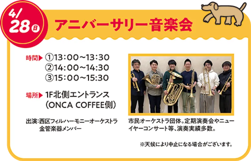 ミーナ天神1周年を記念して、福岡市で活躍する「西区フィルハーモニーオーケストラ 金管楽器メンバー」による演奏会を開催いたします。