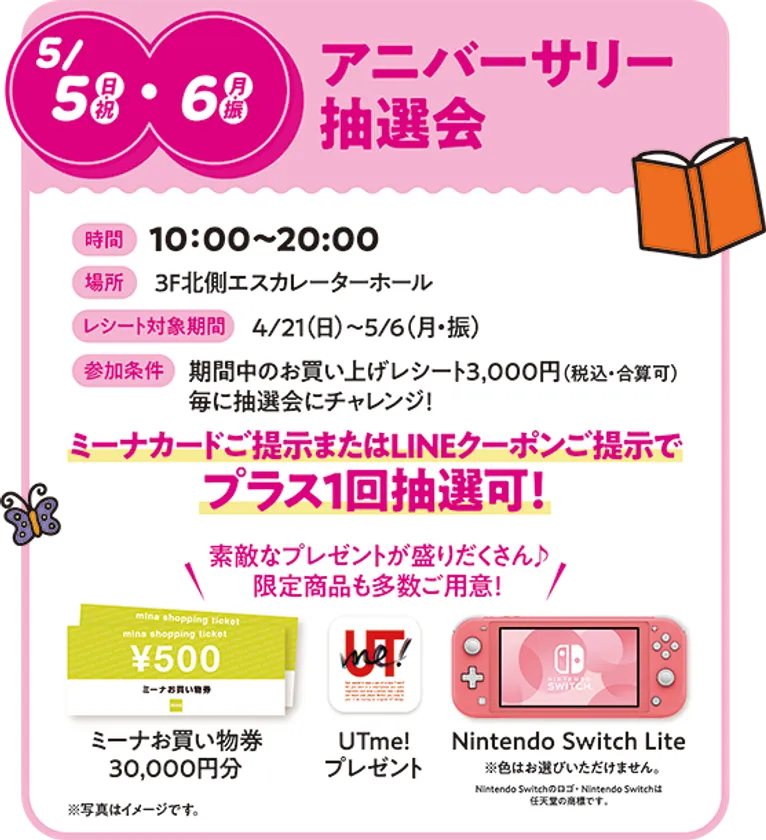 お客様に1年間の感謝を込めて、アニバーサリー抽選会を開催いたします。4月21日(日)〜5月6日(月・振)の期間中のお買い上げレシート3,000円(税込・合算可)毎に抽選会にチャレンジできます。さらにLINE友だち限定クーポンまたはミーナカードご提示でプラス1回抽選可能。抽選でミーナお買い物券30,000円分など合計1,000名様にミーナ天神限定の素敵なプレゼントが当ります。