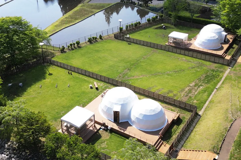 ブリリアントヴィレッジ日光は、約32,700m2(10,000坪)の広大な敷地内に18棟のドームテントが点在、広い場内はリードをつけてのお散歩は自由です。