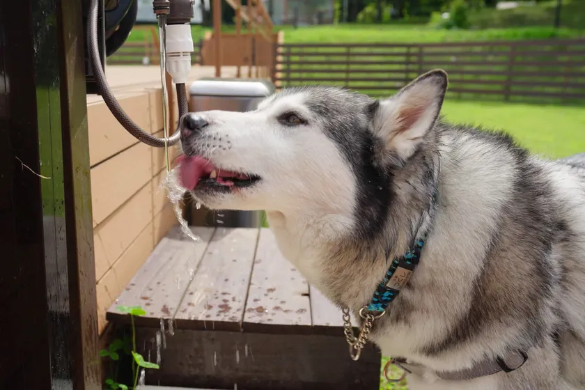 ドッグ棟は広々快適な6m+7mのツインドーム、4ベッドの寝室とケージ付き。リビングルームはエアコン2台完備の一年中快適な空間で、ワンちゃんと一緒にお寛ぎいただけます。温水付き外水道があるため、遊んだ後もきれいに洗浄が可能で、テント内はいつも清潔です。