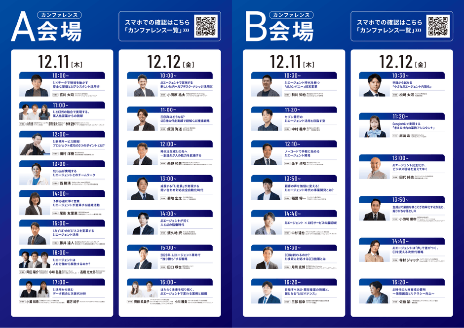 「AIエージェント博 by AI博覧会」は12月12日(金)が最終日となります。2日目も引き続き、最新ソリューションの展示デモが行われるほか、AIエージェントの具体的な活用事例や、ビジネスの現場に定着させるための実践的な方法など、明日のビジネスに直結する見逃せないセッションが多数予定されています。