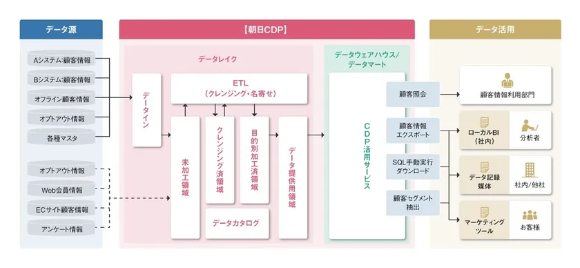 2023年11月から本格的に利用が開始された「朝日CDP」は、各システムで別々に管理されていたデータを新しいCDPに集約し、扱いやすい形式への加工・抽出を可能にする顧客データ統合環境を実現しました。これにより、保守コストの削減と共に、マーケティング施策の強化など顧客データの活用を促進するための基盤が整備されました。