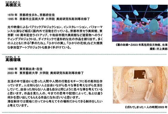 いくらまりえ、ウ・ヒョンミン、小畑亮平、開発好明、金氏徹平、川俣正、北川太郎、城戸みゆき、佐藤圭一、さわひらき、鈴木将弘、高田治、高橋匡太(※1)、高橋瑠璃(※1)、生田目礼一、春田美咲、布施琳太郎、船井美佐、松田修、三梨伸、宮永愛子、葭村太一、WA!moto.“Motoka Watanabe”(2024年3月15日現在)