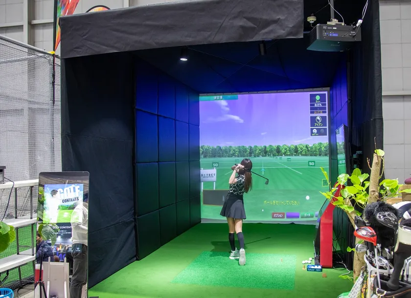 コンポーネントコーナーでは、ユニバーサルゴルフ社がオリジナルで開発したインドアゴルフ組み立てキットに、WUXGA(1,920×1,200)解像度の高輝度、短焦点レーザープロジェクター「LU935ST」が、創建メガのゴルフシミュレーターとの組み合わせで設置。同ブースでは、ゴルフタレントのいづみんさんが試打を行い、来場者の注目を集めました。