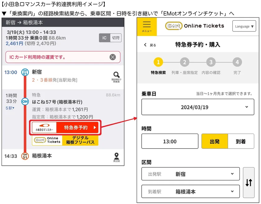 予約連携では、「乗換案内」で小田急ロマンスカーを含むルートを検索すると「特急券予約」ボタンが表示されます。タップすると乗車区間や日時を保持したまま「EMotオンラインチケット( https://www.emot-tickets.jp )」に遷移し、簡単かつ迅速にロマンスカーの特急券の予約・購入ができます。