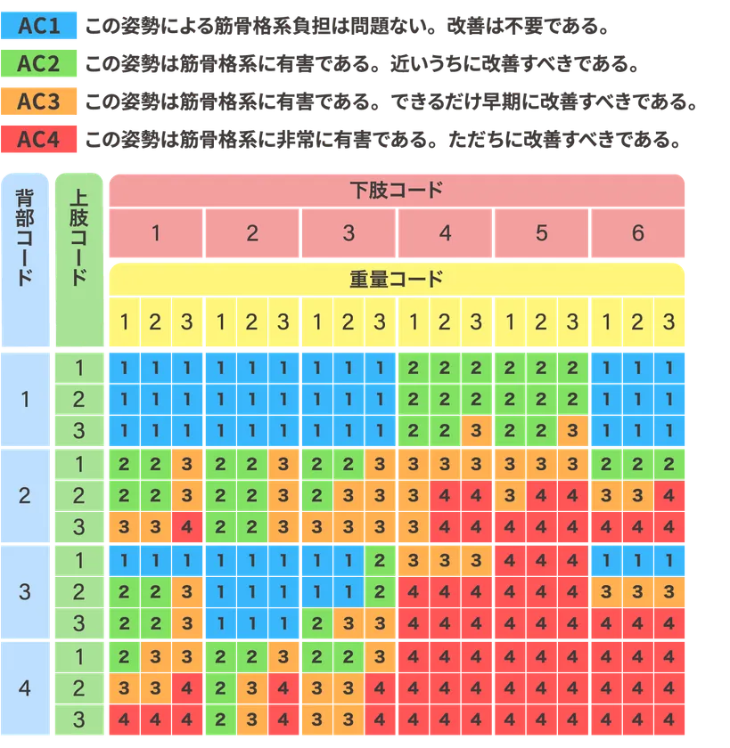 独自に作業姿勢を4項目でとらえ、これをコード分類し導き出されるコードの組み合わせから4段階の改善要求度で姿勢を評価します。改善要求度はAC(ActionCategory)値の以下の4つに判定され、VP-ErgonoのAIによって自動評価されます。