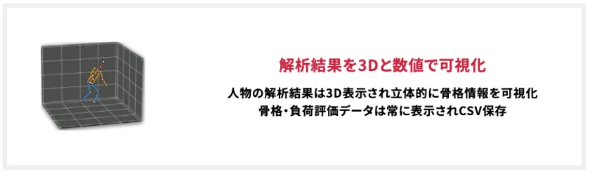 「VP-Ergono」はリアルタイムで人物の骨格情報から作業者の負荷を自動解析出来る最新のAIエルゴノ評価システムで、評価者による定性的な判断ではなく、AIによる定量的な評価結果を算出します。