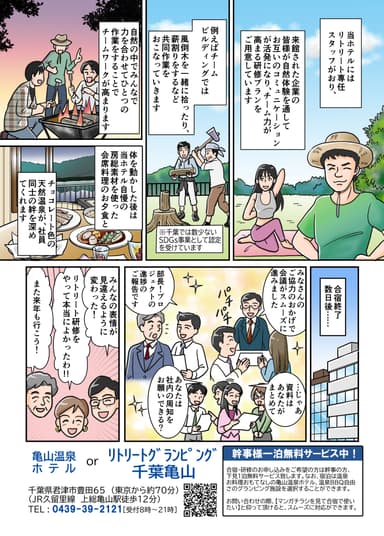 有限会社亀山温泉ホテル(代表取締役:鴇田 英将)は、人気のリトリート研修の漫画チラシの作成記念として、幹事1名無料の企業研修、チームリトリートの募集キャンペーンを、令和6年4月1日に開始します。
