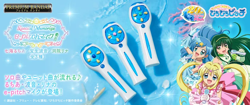 2003年より放送されたテレビアニメ『マーメイドメロディー ぴちぴちピッチ』の放送20周年を記念し登場したSpecial Memorizeシリーズ第1弾の「アクアピッチ」に続き、七海るちあ、宝生波音、洞院リナが変身後に手にするマイク、「e-pitchマイク(イーピッチマイク)」を大人向けなりきり玩具仕様で商品化いたします。