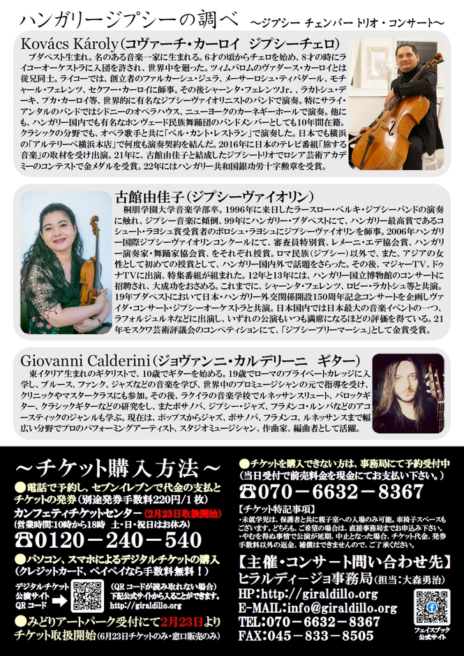 ハンガリーから「銀の十字勲章」を受章したチェリスト、コヴァーチ・カーロイをむかえ、イタリア人ギタリスト、ジョバンニ・カルデリーニ、日本で唯一のジプシーヴァイオリニスト古館由佳子が「ジプシー チェンバー トリオ」を結成。世界中で親しまれているジプシー音楽をお届けします。 カーロイ氏は、子供たちのジプシーオーケストラとして世界中で大人気だった「ライコーオーケストラ」に幼くして入団、世界中で活躍しているジプシーチェロの名手。楽譜無しで自由に伴奏でき、即興的要素もあり、クラシック奏者には真似出来ない、その素晴らしい演奏をお楽しみに!