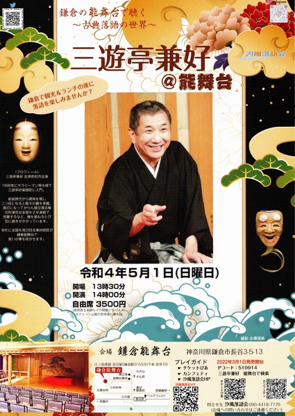 汐風落語会主催、~鎌倉の能舞台で聴く古典落語の世界~『三遊亭兼好@能舞台』が2022年5月1日 (日)に鎌倉能舞台(神奈川県鎌倉市)にて開催されます。チケットはカンフェティ(運営:ロングランプランニング株式会社、東京都新宿区、代表取締役:榑松 大剛)にて3月1日(火)より発売開始です。