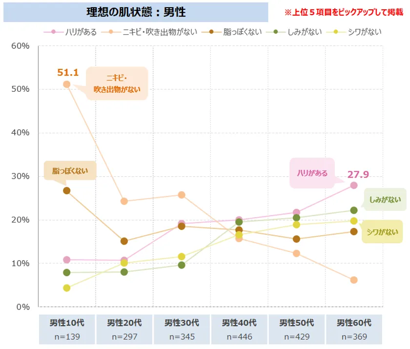 理想の肌状態について、男性は「ハリがある」「ニキビ・吹き出物がない」「脂っぽくない」「しみがない」「シワがない」がTOP5。男性1位の「ハリがある」は60代で最も高く、10-20代との年代差が顕著。一方で「ニキビ・吹き出物がない」は男性10代が5割強と高い。女性は、「透明感がある」「ハリがある」「しみがない」「毛穴が目立たない」「キメ細かい」がTOP5。女性1位の「透明感がある」は他の理想の肌状態と比べて年代差が小さく、いずれの年代でも支持されている。「ハリがある」「しみがない」という加齢により顕在化する悩みについては、年代差が大きく、特に50-60代において高い。
