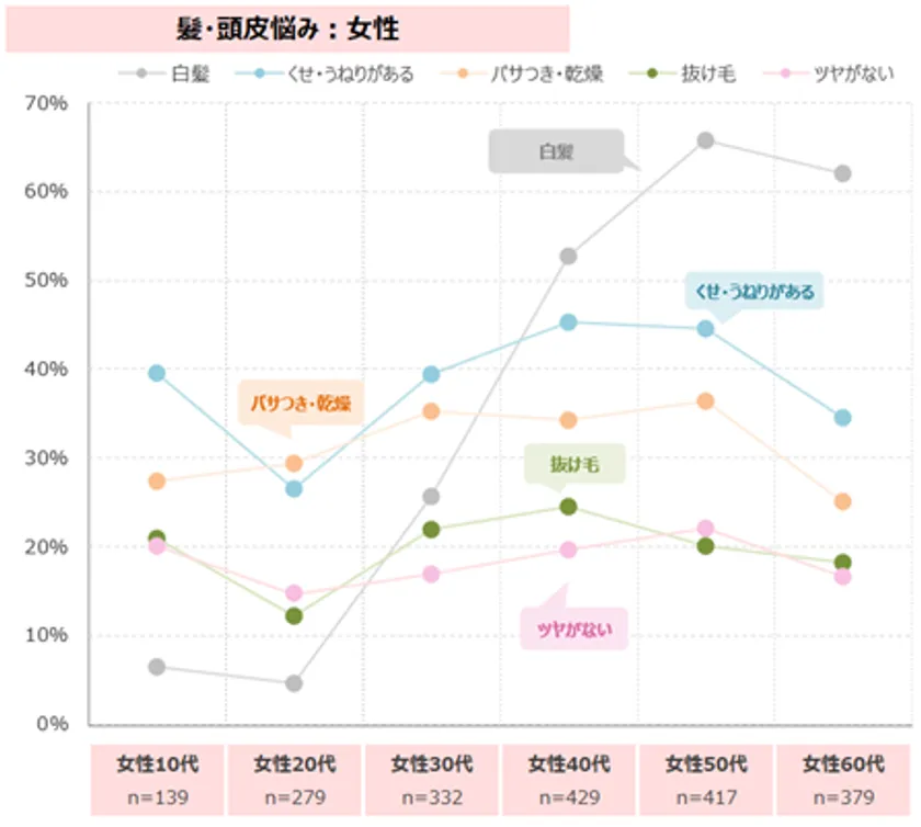 ・髪・頭皮悩みは、男女ともに「白髪」が1位。女性は「くせ・うねり」悩みも高い