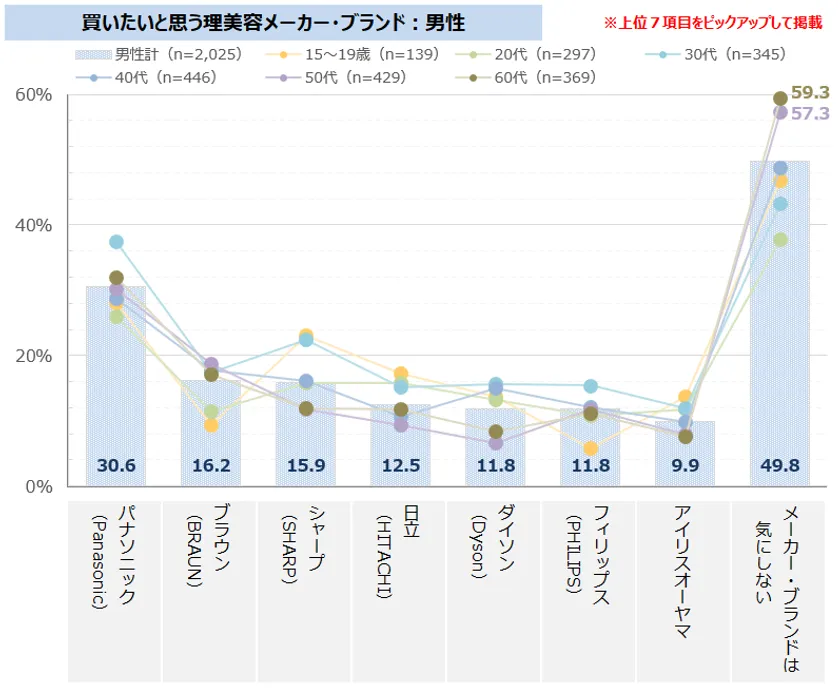 買いたいと思う「理美容家電メーカー・ブランド」は、いずれの年代でも「Panasonic(パナソニック)」が1位だった。ただし、男性50-60代は「メーカー・ブランドは気にしない」が6割弱と顕著に高い。また、男性10代と30代は「シャープ(SHARP)」が他の年代と比べて高い。