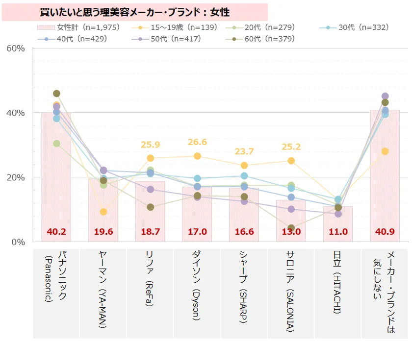 女性10代は、「ダイソン(Dyson)」「シャープ(SHARP)」「リファ(ReFa)」が女性計と比べて5ポイント以上高く、「サロニア(SALINIA)」は女性計と比べて10ポイント以上高い。また、「メーカー・ブランドは気にしない」が他の年代と比べて顕著に低い。