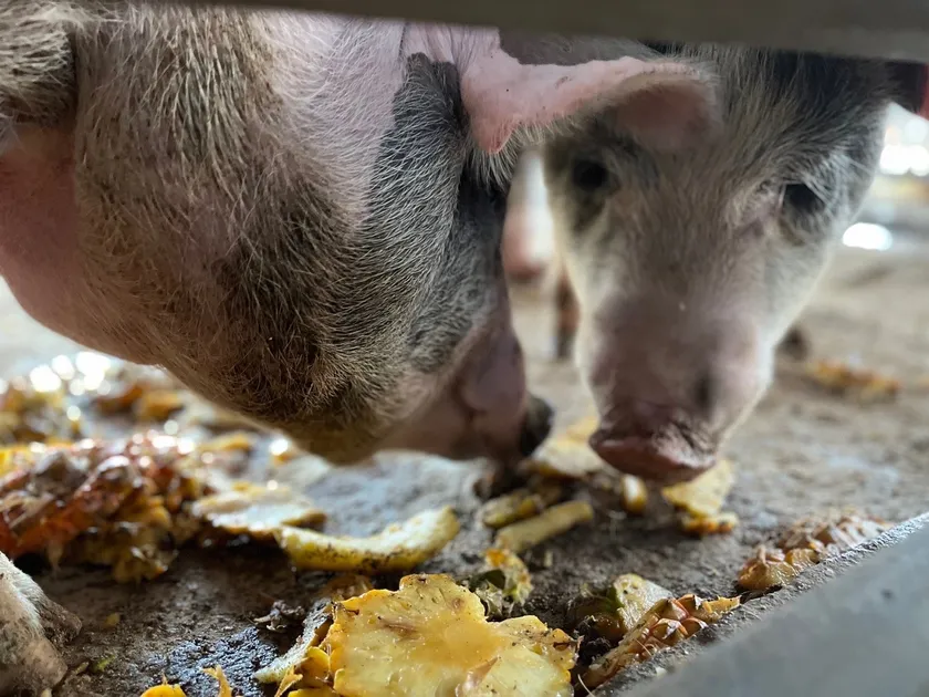 父豚が純血アグー種、母豚に西洋豚をもつアグー豚(F1種)は幸福牧場で生まれ、石垣島のパイナップルの搾り粕とふすまを混ぜた自社オリジナルの発酵飼料を食べて大自然の石垣島ですくすく育ちます。そんな自社ファームで愛情たっぷりに育てた豚を「南ぬ豚(ぱいぬぶた)」として日本全国へ届けています。年間出荷頭数も500頭と非常に希少性の高いブランド豚です。