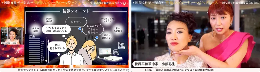 この度、2024年3月8日にオンラインで実施した『ビューティーマジックフェス~一瞬で誰もが振り返る美女になる~』の詳細や当日の様子をご報告いたします。当日のライブ同時視聴者数は1,140名以上、2024年3月18日現在で動画の再生回数は9,400回を超えています。