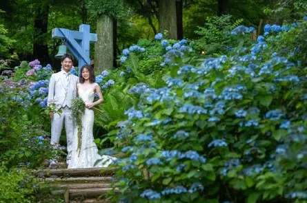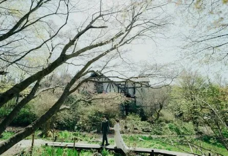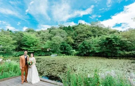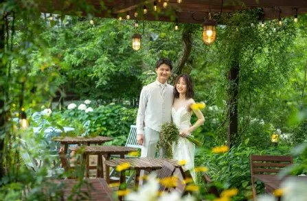 当施設内で新たなウェディングフォトプランが誕生しました。ヘアメイクや衣装をお任せで、四季折々に表情を変える風景の中、思い出の写真が撮影できます。