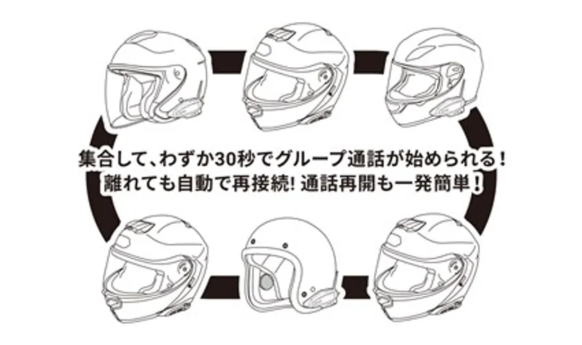 「SX1」同士はもちろん、「SB6XR」「SB6X」「ONE」の4機種をふくめたグループであれば、最大6人まで通話が可能です。B1ボタンとB2ボタンを同時に押すだけで、スムーズに会話を始めることができます。
