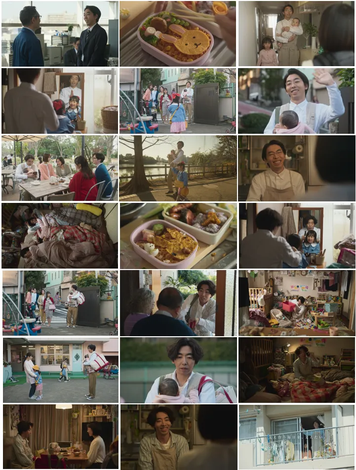 場面は変わり、目が覚めるとそこは現実の世界に。今までの育休生活は夢だったことに気が付き、現実の育児に奮闘します。育休取得時は上司や同僚に不安な顔をされ、実際のお弁当作りはうまくいかない。長女のヘアアレンジも上手くいかず怒られます。次女は祖父母の家に預け、その間に溜まっている家事を済ませ、幼稚園へお迎えに。長女には「パパやだ~まだ帰りたくない~」と言われ傷心。夜になり子どもたちが就寝すると、帰路に就くママと電話をします。「大丈夫?」と心配され、「なんとか。やっぱりかわいいね」と疲れた表情をみせつつも、子どもたちの寝顔を見て微笑みます。ママが帰宅し、いびつなハンバーグを「こんなんでごめん…」と出します。ママから「ありがとう。めちゃくちゃ感謝してる」という言葉をもらい笑顔を見せます。
