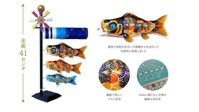伝統の手捺染技法を駆使した、史上最小のこいのぼり「卓上こいのぼり京錦」を2024年3月1日に販売開始しました。小さいながらも空で泳ぐ大きいこいのぼりと同じように、創業者 徳永春穂の手がけた繊細な絵柄の錦鯉を再現しています。