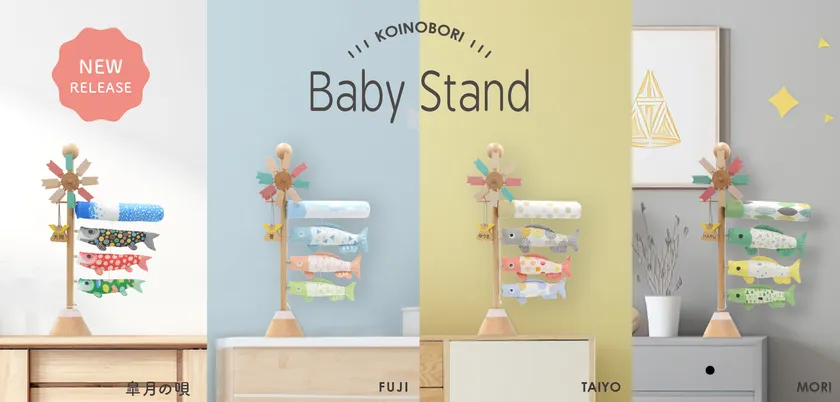 柔らかなパステルカラーに、かわいらしい表情のこいのぼり「BABY STAND KOINOBORI」、スタンドには伝統的な矢車と日本の象徴である富士山をあしらっています。