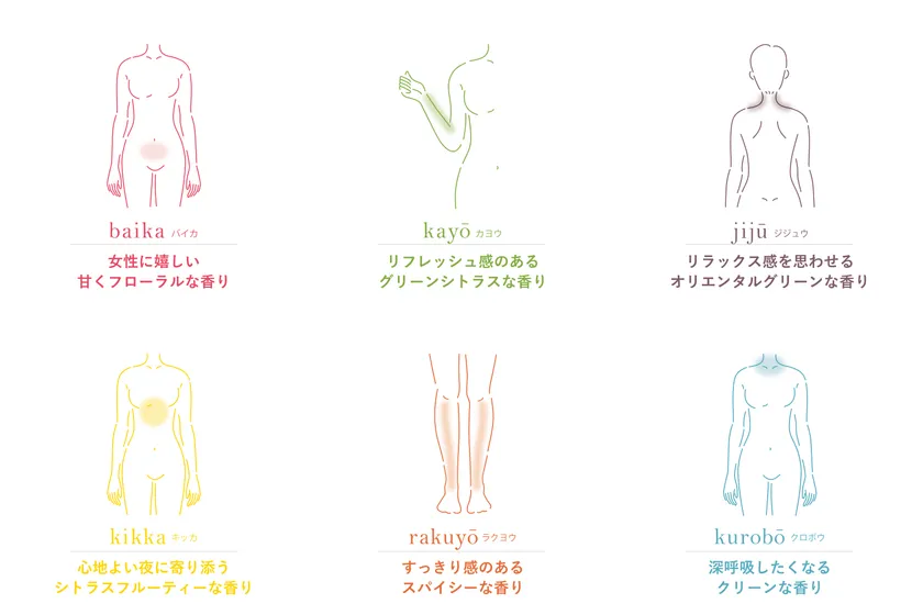 ▼Point1 天然精油の香りで、ひとりひとりのお悩み6タイプにアプローチする香り。