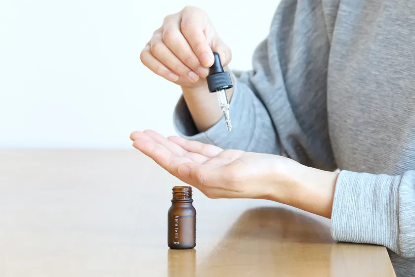 スポイト2~3滴のオイルを手に取り、肌や髪に塗布してご使用ください。
