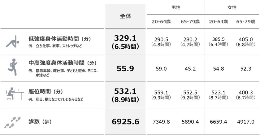 ※活動量計を用いた本共同研究では、WHO(世界保健機関)が定める、3メッツ以上=中高強度/1.6~3メッツ未満=低強度の身体活動量も計測している。