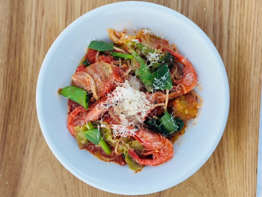 甘海老と春野菜のトマトチーズパスタ